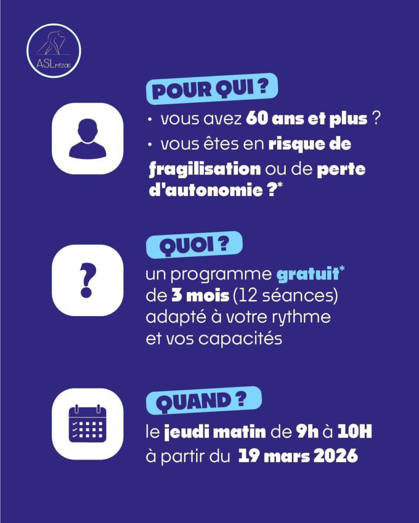 ✅ Vous avez 60 ans et plus et êtes en risque de fragilisation ou de perte d’autonomie ✅ Vous serez encadré et suivi par notre coach de l’ASL Mézois ✅ La marche nordique est une activité douce permettant de renforcer le corps, d’améliorer l’équilibre et la respiration, à votre rythme ✅ Vous participerez à une expérience adaptée pour reprendre une activité et progresser progressivement ✅ Le tout dans la bonne humeur et le plaisir de bouger ensemble