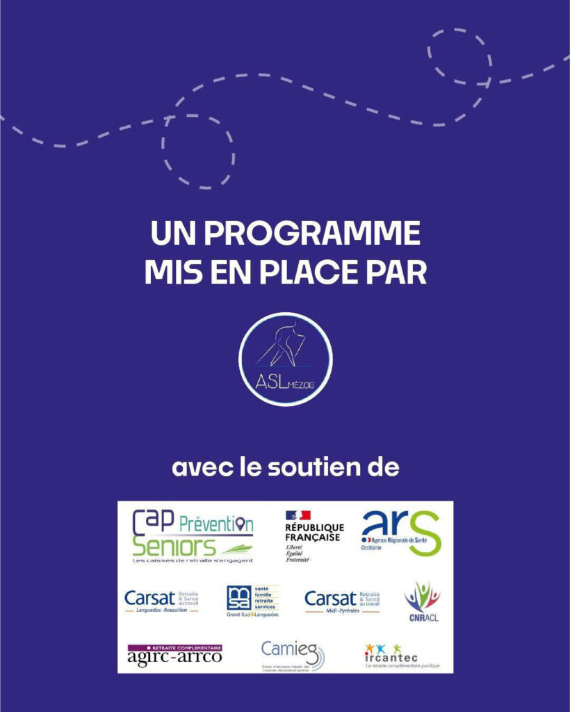 📅 Quelques places sont encore disponibles – Contactez-nous pour réserver votre place. Programme mis en place par l’ASL Mézois, financé par **Cap Prévention Seniors**, l’Agence Régionale de Santé Occitanie, la **CARSAT**, avec le soutien de la Ville de Mèze, labellisée « Ville Vivez Bougez ».