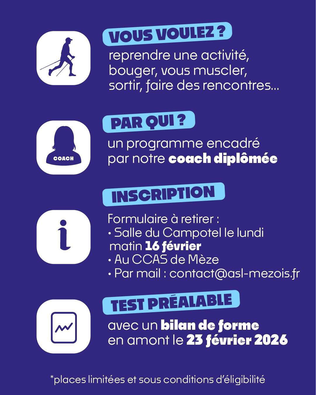 ✅ Vous avez 60 ans et plus et êtes en risque de fragilisation ou de perte d’autonomie ✅ Vous serez encadré et suivi par notre coach de l’ASL Mézois ✅ La marche nordique est une activité douce permettant de renforcer le corps, d’améliorer l’équilibre et la respiration, à votre rythme ✅ Vous participerez à une expérience adaptée pour reprendre une activité et progresser progressivement ✅ Le tout dans la bonne humeur et le plaisir de bouger ensemble