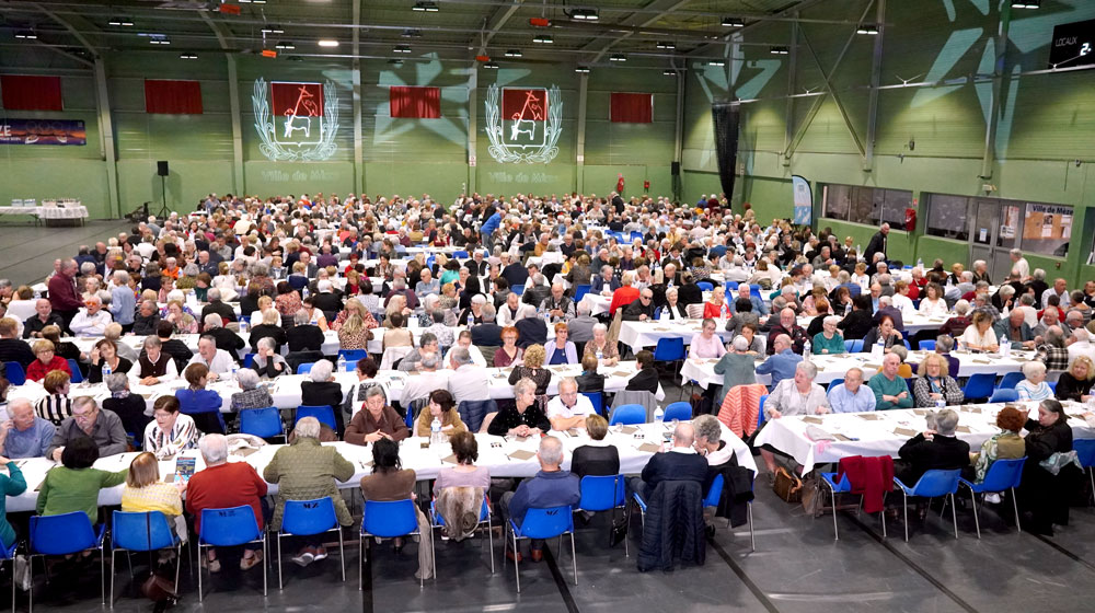 Quelque 760 convives et des membres du conseil municipal étaient rassemblés dans la salle Bernard Jeu transformée pour l’occasion en immense salle de restauration. Plus de 1000 seniors qui ne souhaitaient ou ne pouvaient pas participer au repas se sont vu remettre un colis gourmand pour les fêtes de Noël.