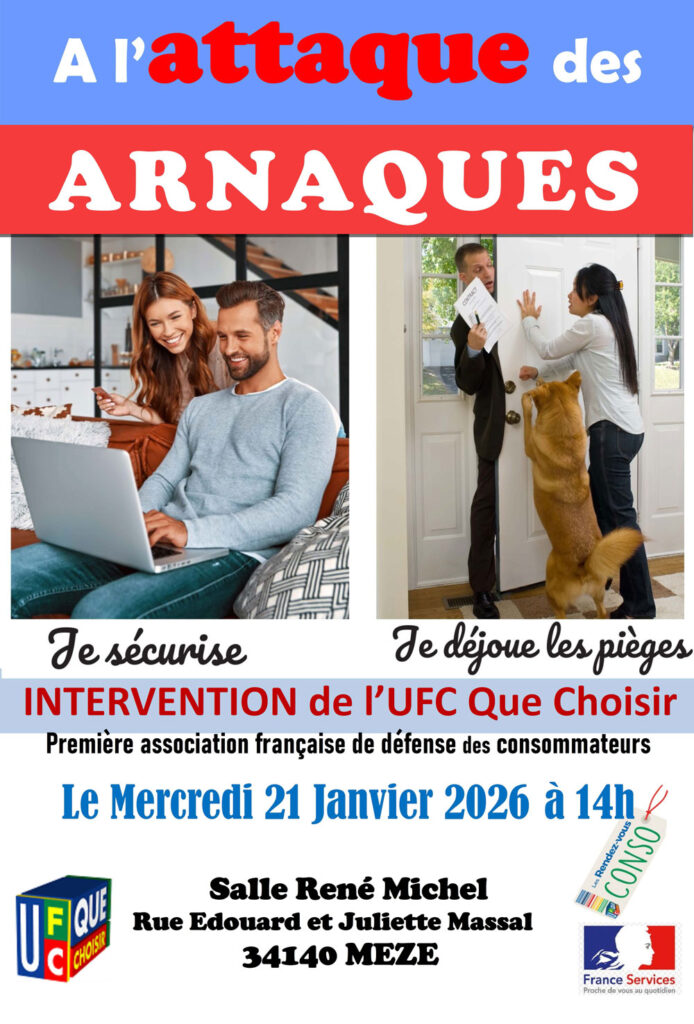 Le C.C.A.S de la Ville de Mèze accueillera l’UFC Que choisir pour une intervention consacrée à la prévention des arnaques et à la sécurité des consommateurs le mercredi 21 janvier 2026 à 14h, salle René Michel.