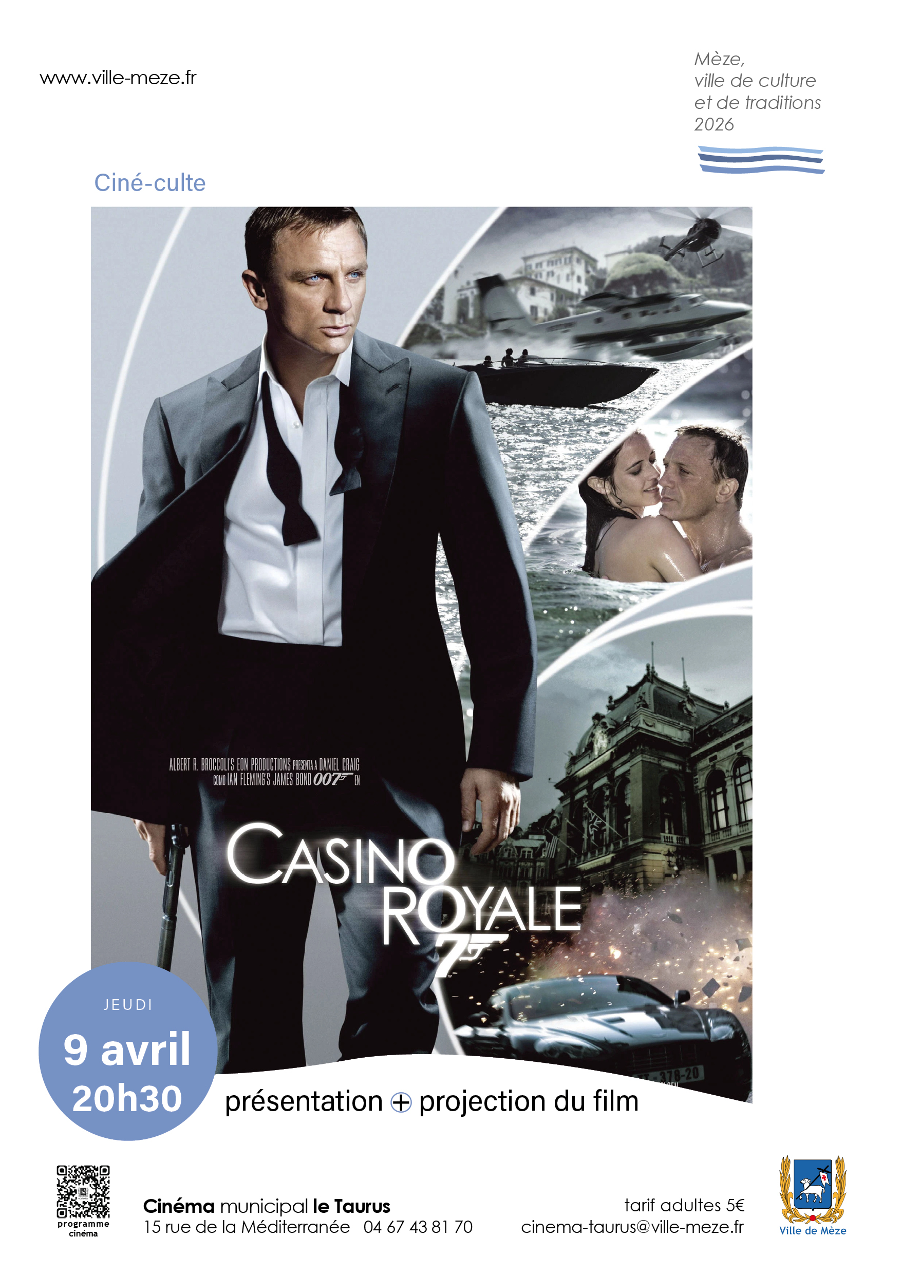 au cinéma municipal Le TaurusCiné-culte: JAMES BOND CASINO ROYALE, le jeudi 9 avril à 20h30 Présentation + film Synopsis: James Bond affronte le tout-puissant banquier privé du terrorisme international. Il doit le battre lors […]
