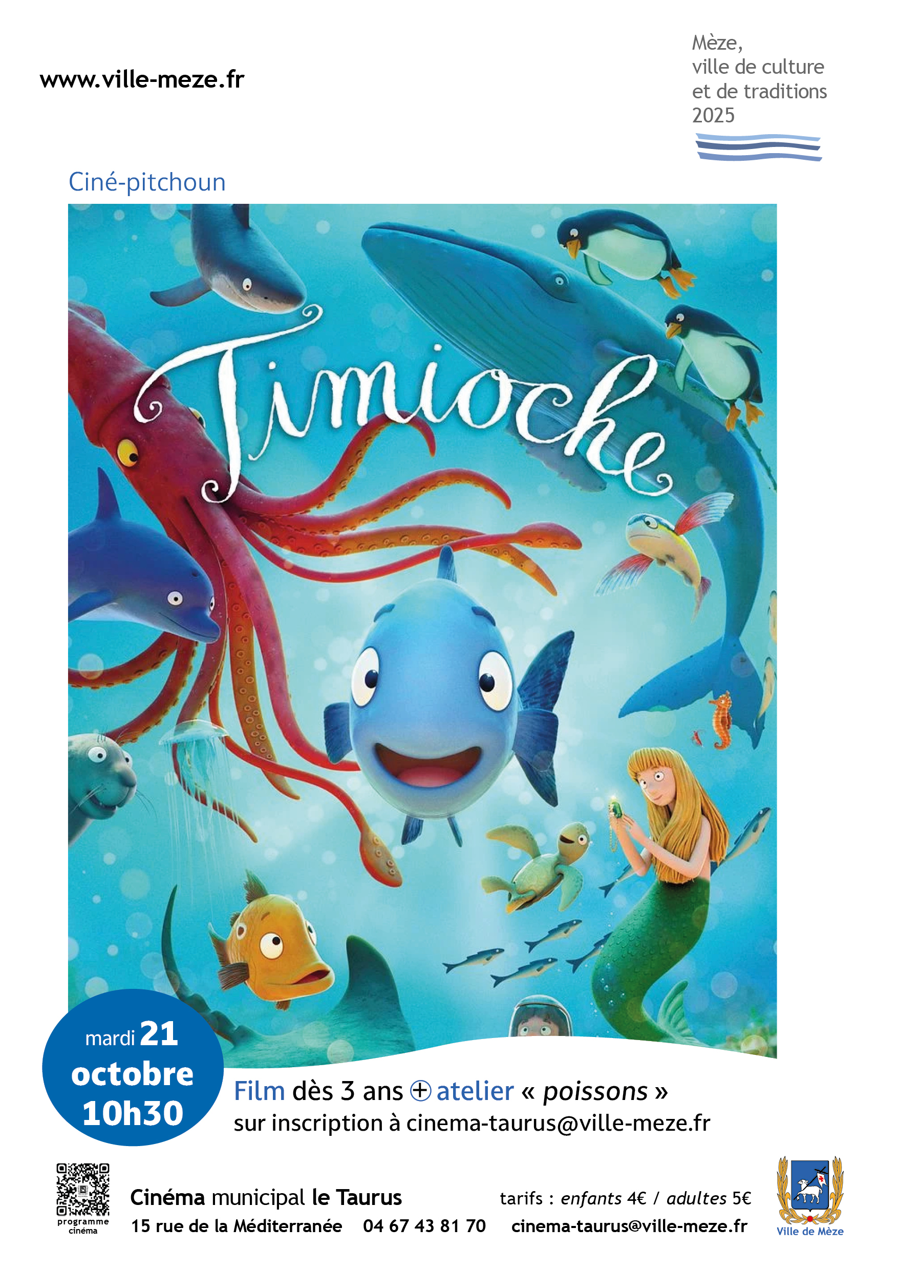 au cinéma municipal Le Taurus Rue de la MéditerranéeMardi 21 octobre à 10h30, nous projetterons Timioche, adapté du livre d'enfants éponyme, en séance ciné-pitchoun ! Tarif adulte : 5 €, enfant : 4 € Synopsis : Le petit poisson qui racontait des histoires… Timioche, un petit poisson toujours en retard, adore inventer des excuses, souvent plus grosses que lui ! Jusqu’au jour où […]