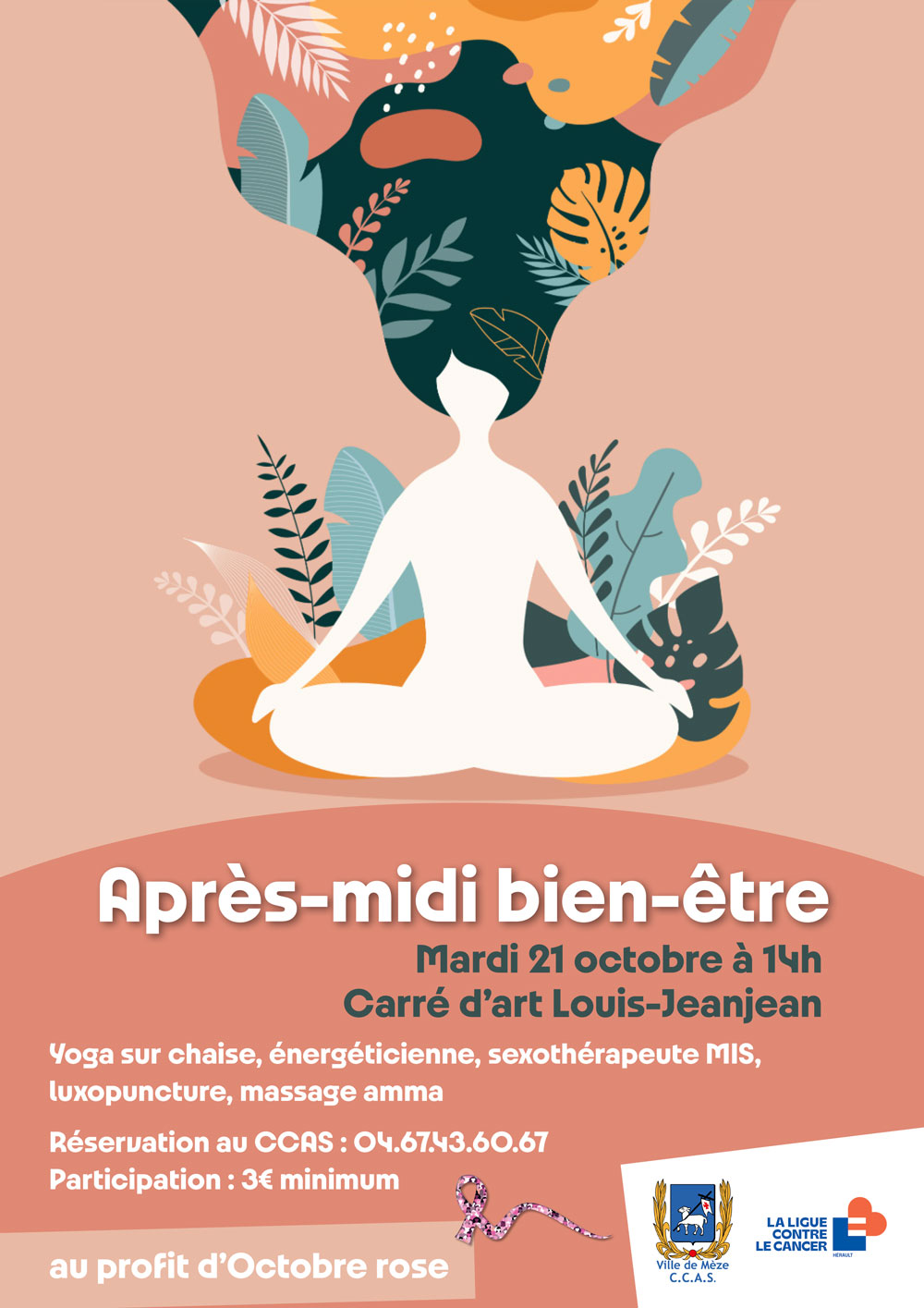 au Carré d'art Louis-Jeanjean MèzeYoga sur chaise, énergéticienne, sexothérapeute MIS, luxopuncture, massage amma Réservation au CCAS : 04.67.43.60.67 - Participation : 3€ minimum.