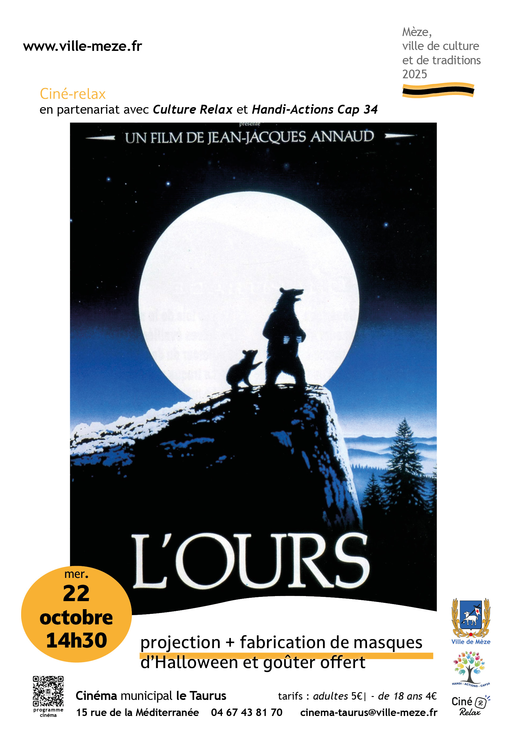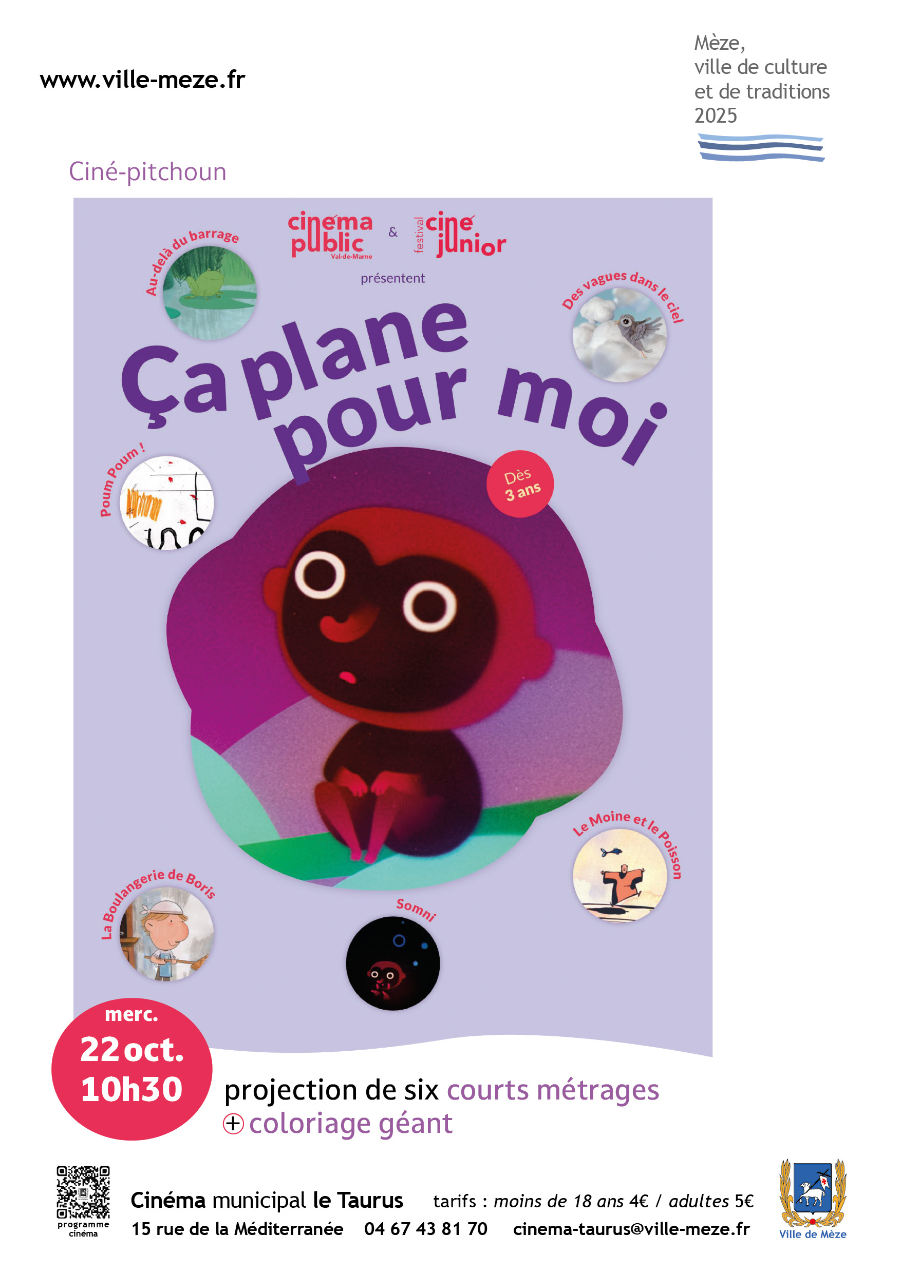 au cinéma municipal Le Taurus Rue de la MéditerranéeSéance spéciale ciné-pitchoun pour les tout petits dès 3 ans, suivie d'un atelier d'Halloween sur inscription à cinema-taurus@ville-meze.fr Tarif adulte 5 € / enfant 4 € Petite frousse Programme de 5 courts-métrages d’animation Un bruit strident, une porte qui claque, une araignée qui tisse sa toile, une ombre inquiétante, la pénombre... Dis, quand est-ce […]