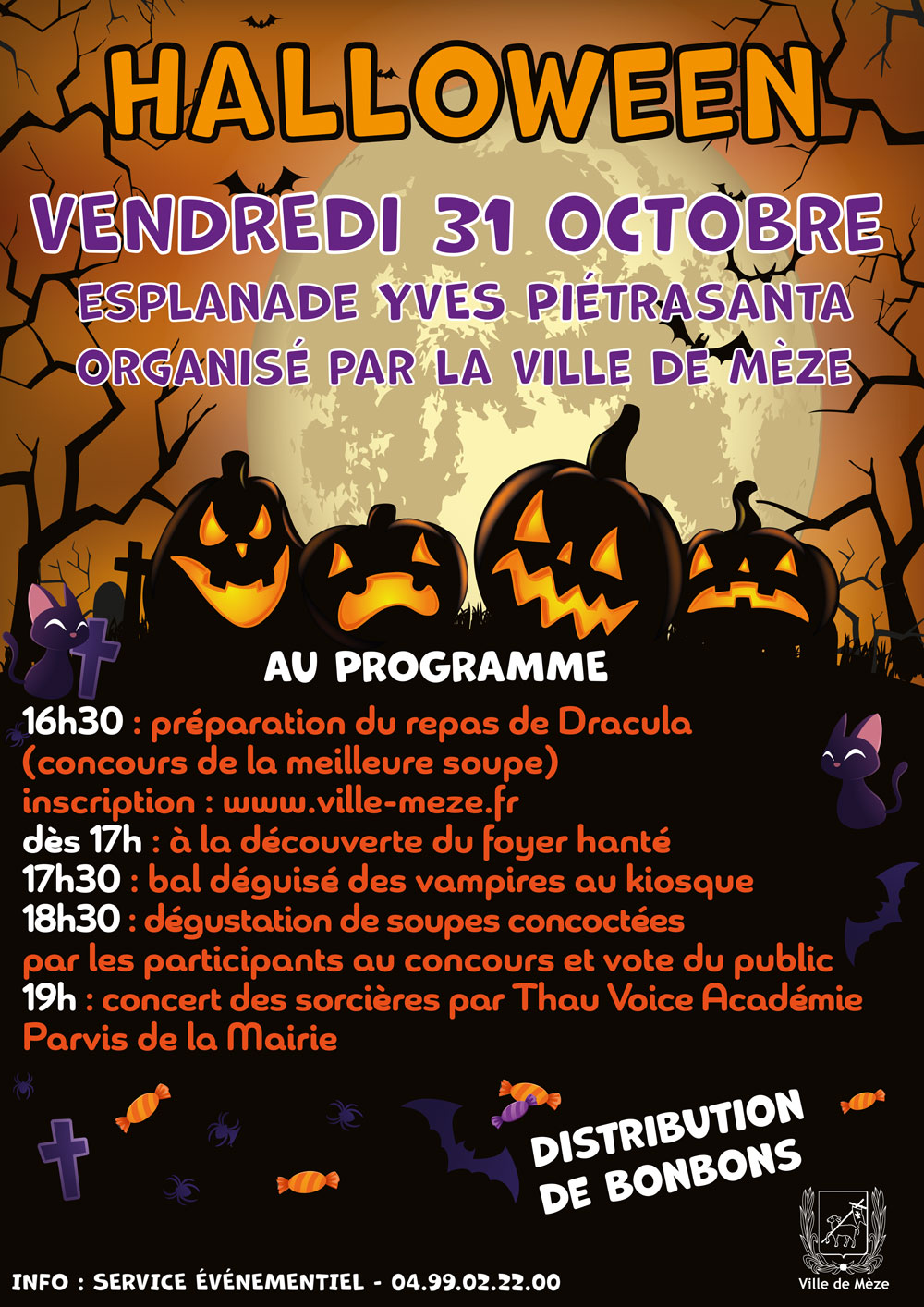 sur l'esplanade Yves PiétrasantaCette année, la journée du vendredi 31 octobre risque d’être terrifiante sur l’esplanade Yves Piétrasanta. Bal d’halloween, animation musicale, distribution de bonbons, concours de la meilleure soupe de courge, visite du foyer hanté à et mini concert seront au programme. Dès 16h30, les participants au concours pourront préparer sur place leur soupe. Inscription obligatoire : >cliquez […]