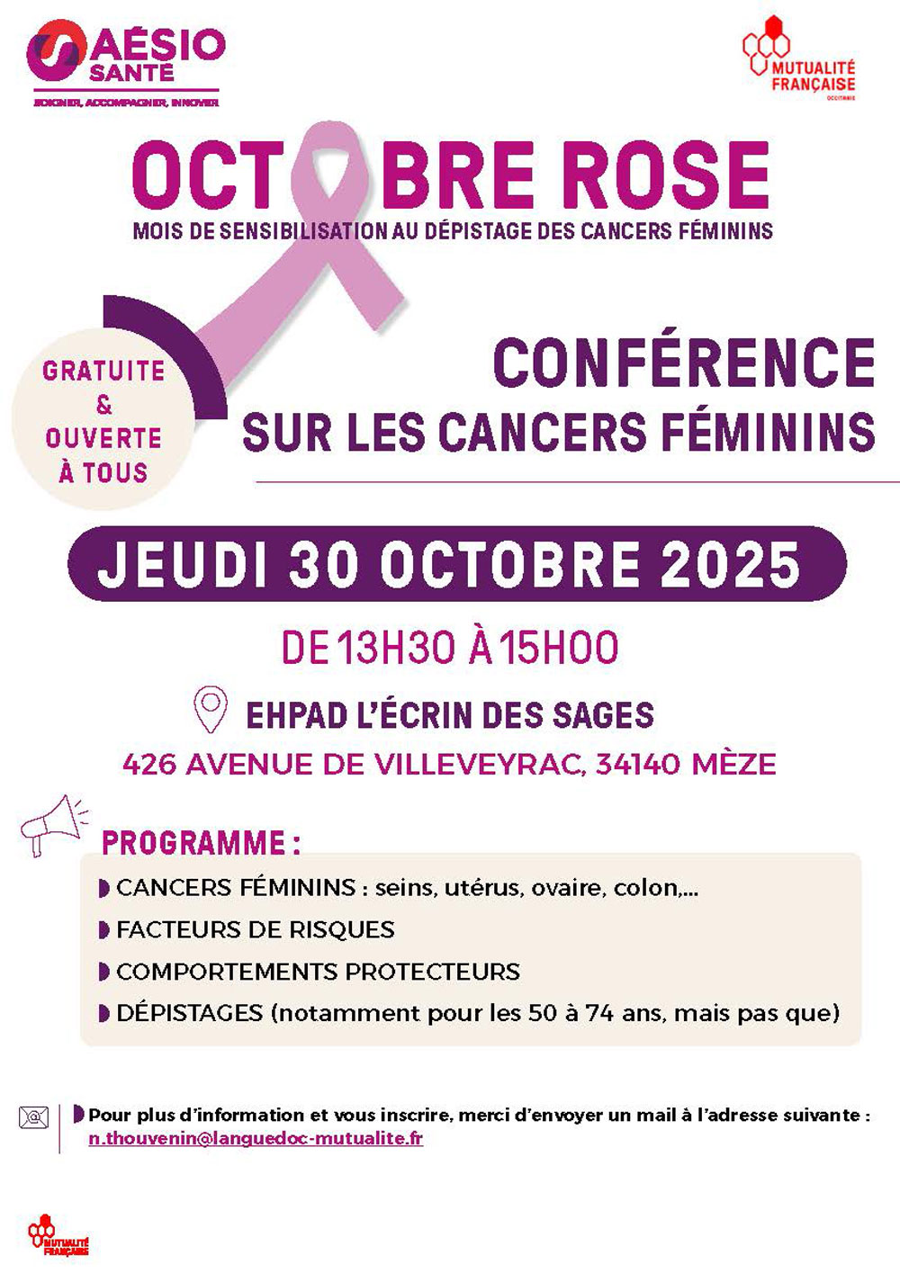 Ehpad "L'écrin des sages"CONFÉRENCE SUR LES CANCERS FÉMININS PROGRAMME : -CANCERS FÉMININS : seins, utérus, ovaire, colon,... -FACTEURS DE RISQUES -COMPORTEMENTS PROTECTEURS -DÉPISTAGES (notamment pour les 50 à 74 ans, mais pas que) Pour plus d’information et vous inscrire, merci d’envoyer un mail à l’adresse suivante : n.thouvenin@languedoc-mutualite.fr
