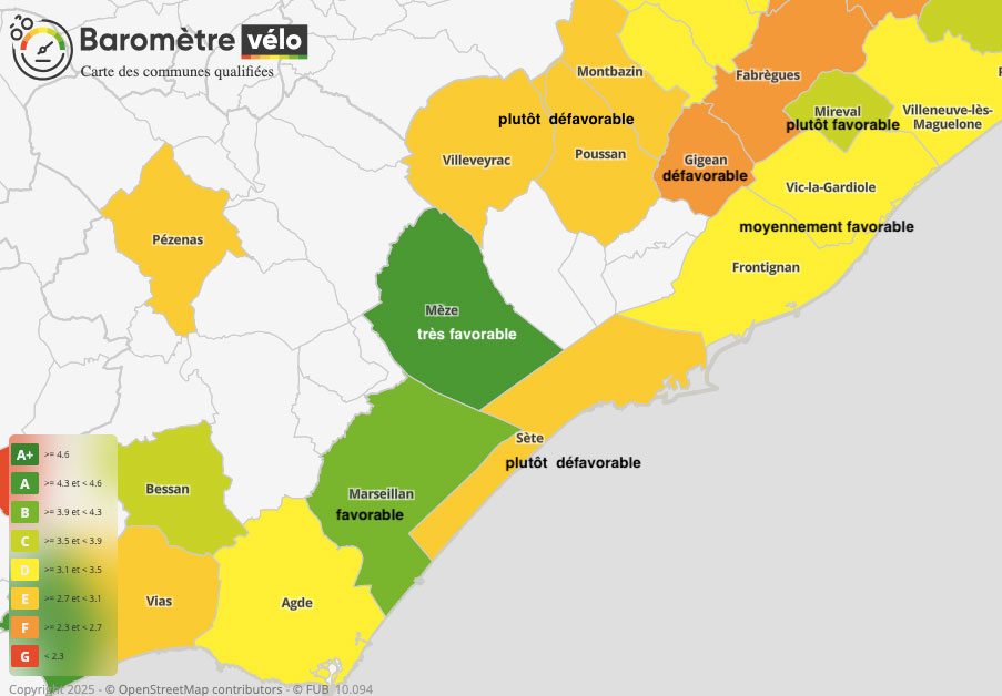 La Ville de Mèze se distingue nettement avec un climat vélo jugé « très favorable », classé en catégorie A, et même en A+ « excellent » concernant l’effort municipal en faveur du vélo.
