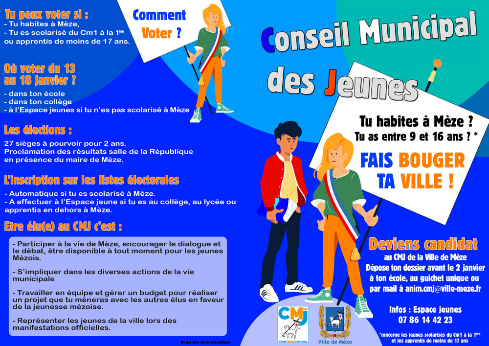 Pour être candidat au CMJ il faut habiter à Mèze et être scolarisé du CM1 à la 1ère (ou être apprentis de moins de 17 ans).