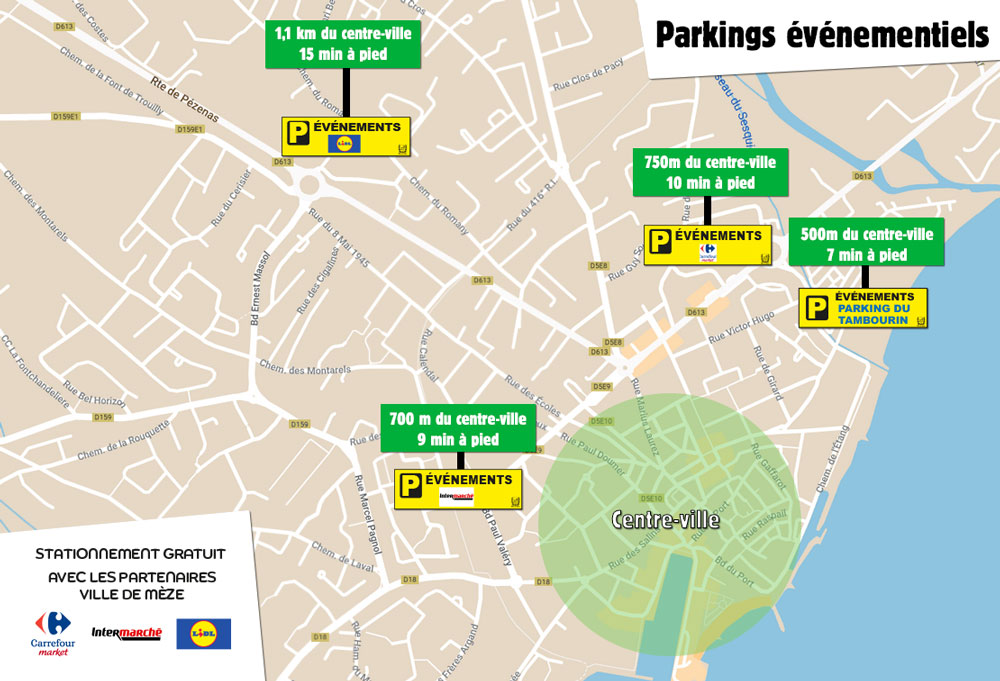 En plus des 400 places disponibles sur le parking du Tambourin (7 minutes à pied du centre-ville), la municipalité a signé une convention avec les trois grandes enseignes de supermarchés de Mèze (Carrefour, Intermarché, et Lidl) pour pouvoir utiliser leurs parkings dès 20h, les soirs de festivités.