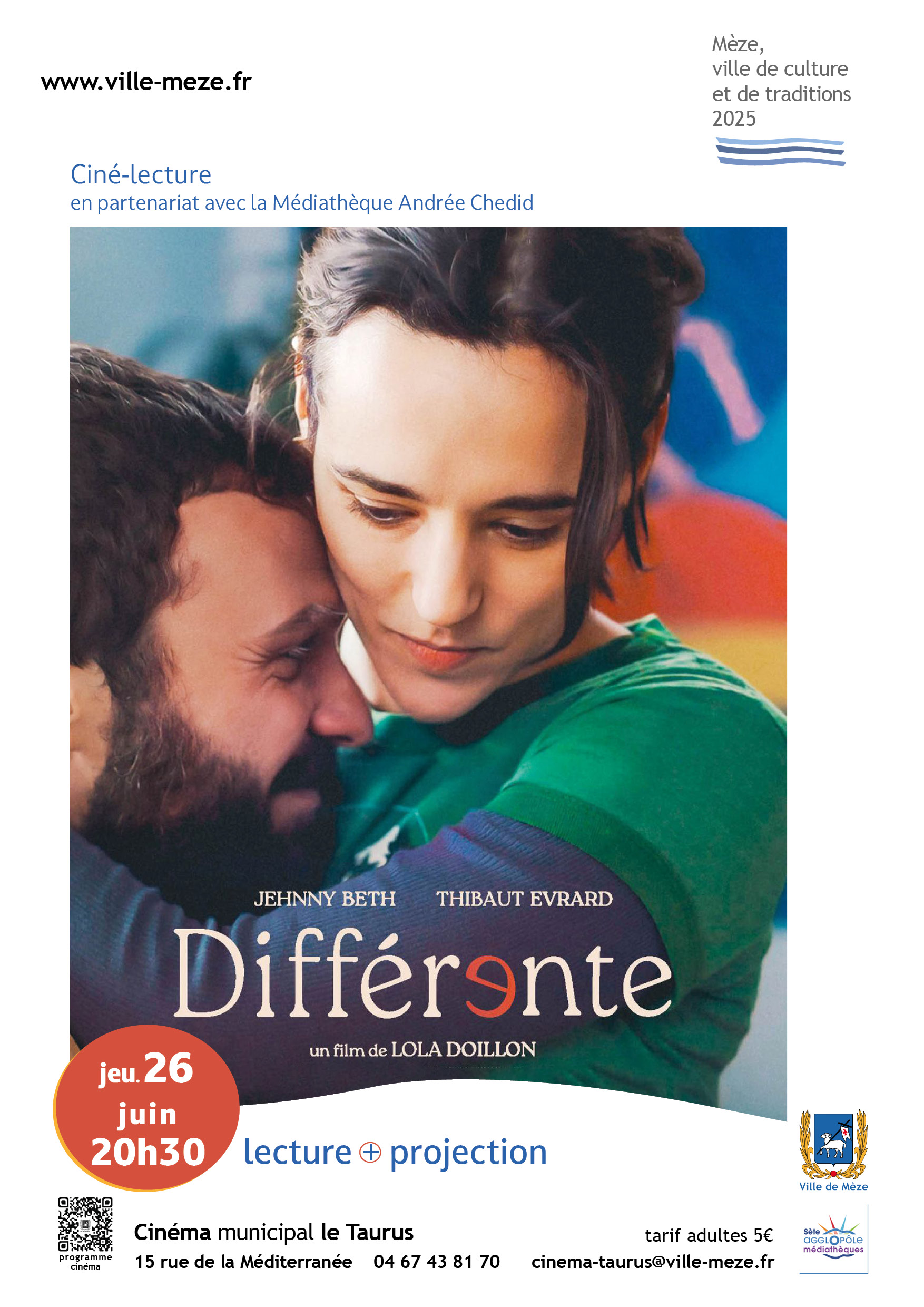 Jeudi 26 juin à 20h30, le cinéma le Taurus organisera une séance ciné-lecture en partenariat avec la médiathèque de Mèze : quelques extraits de textes seront lus avant la projection du film Différente.