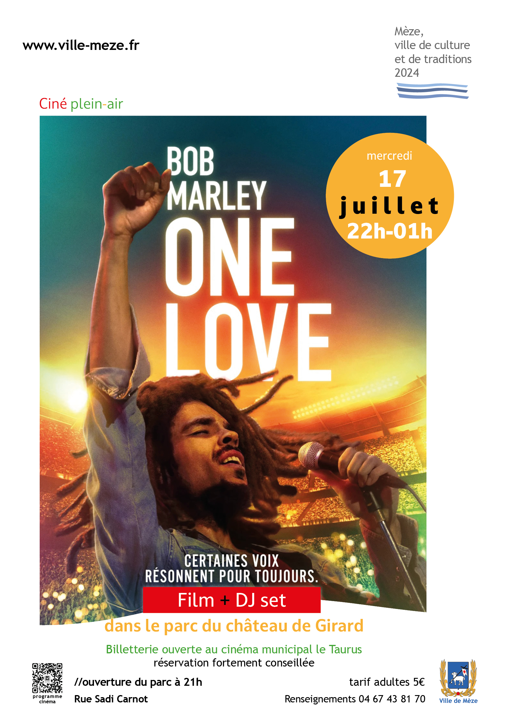Ciné-plein air mercredi 17 juillet à 22h au parc du Château de Girard. Projection du film « BOB MARLEY : ONE LOVE » suivi d’un DJ Set.