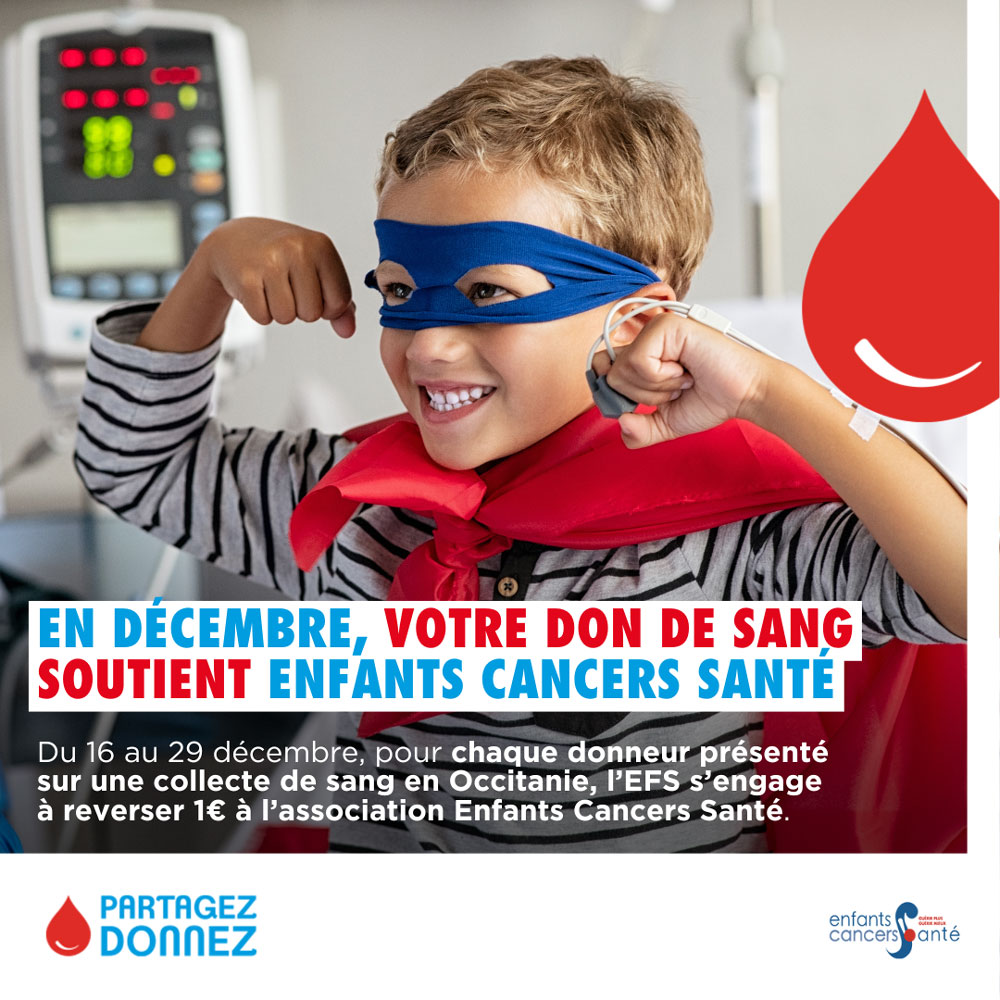 Du 16 au 29 décembre votre don compte double ! En effet, l’EFS s’engage à reverser 1€ à l’association Enfants Cancers Santé pour chaque donneur qui se présente lors d’une collecte du 16 au 29 décembre.