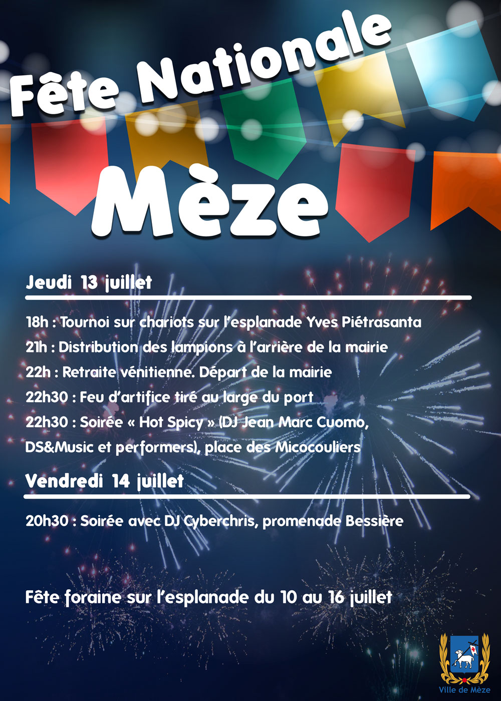 22h : Défilé depuis la place Aristide Briand (distribution de lampions à 21h30 à l’arrière de la mairie), suivi d’un feu d’artifice sur le port de Mèze