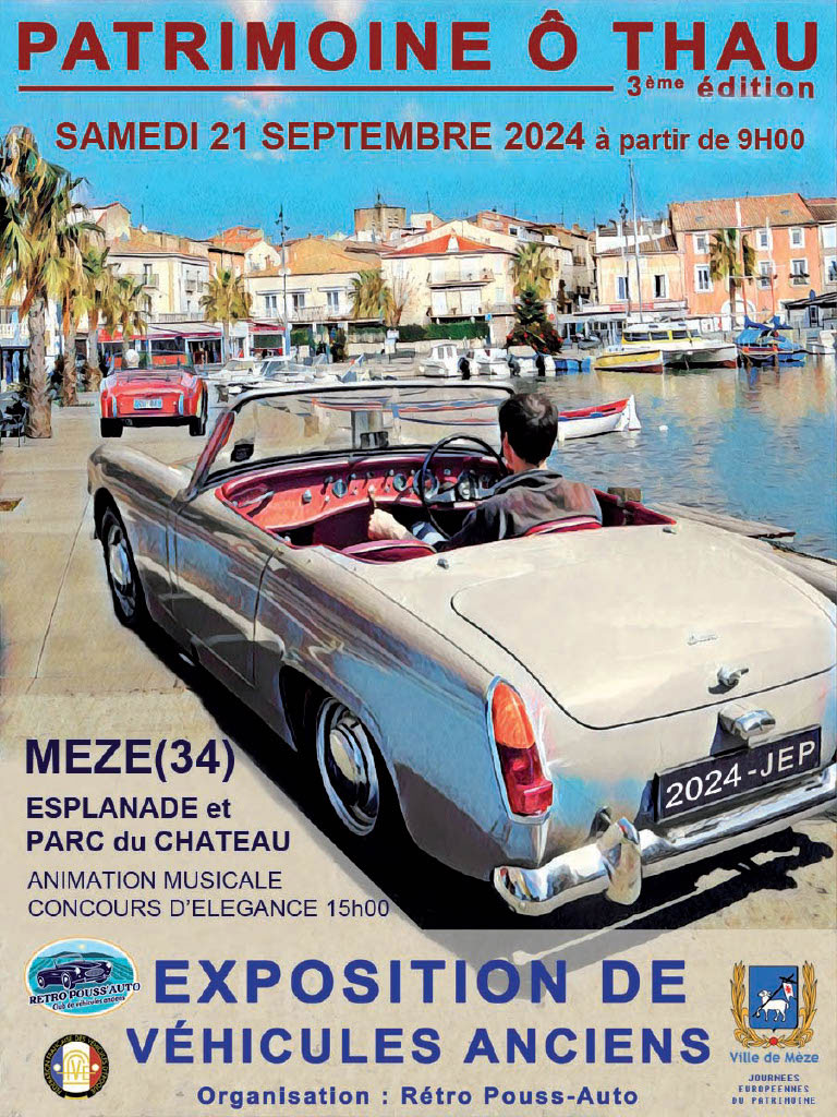 Samedi 21 septembre 2024 la Ville de Mèze accueillera le « 3ème patrimoine Ô Thau », organisé par Le club Rétro Pouss Auto avec le soutien de la municipalité. Ce rassemblement, proposé dans le cadre des journées européennes du patrimoine, est ouvert aux voitures anciennes et de prestige.