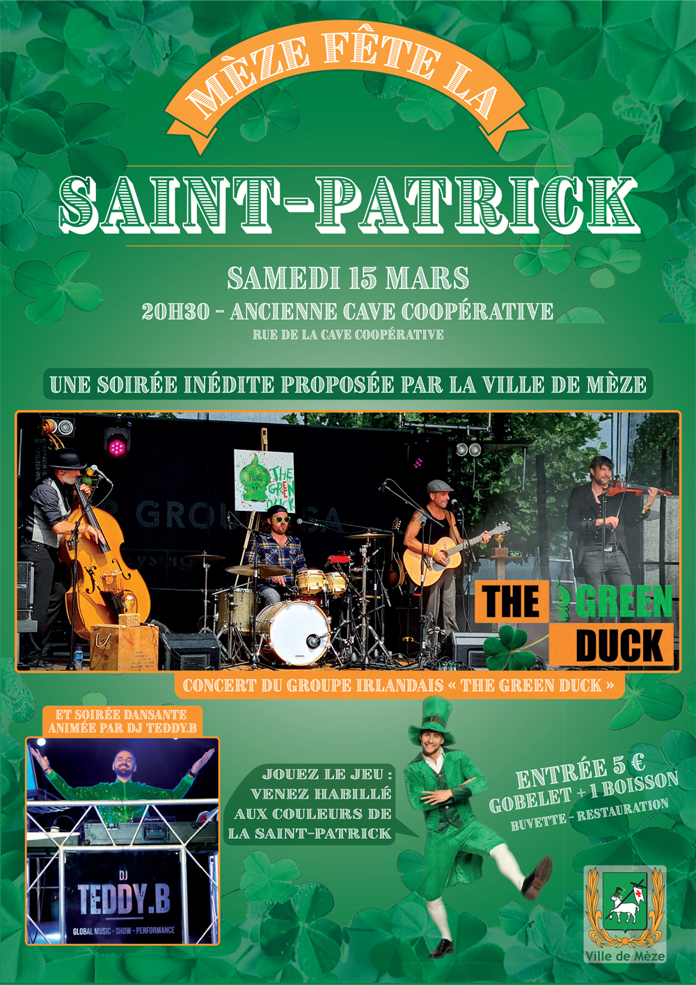 Rendez-vous samedi 15 mars, dès 21h, à l’ancienne cave coopérative avec le groupe « The Green Duck » qui ambiancera cet événement avec des morceaux traditionnels irlandais et des mélodies entraînantes et festives. La soirée se poursuivra sur la piste de danse avec le D.J Teddy.B.