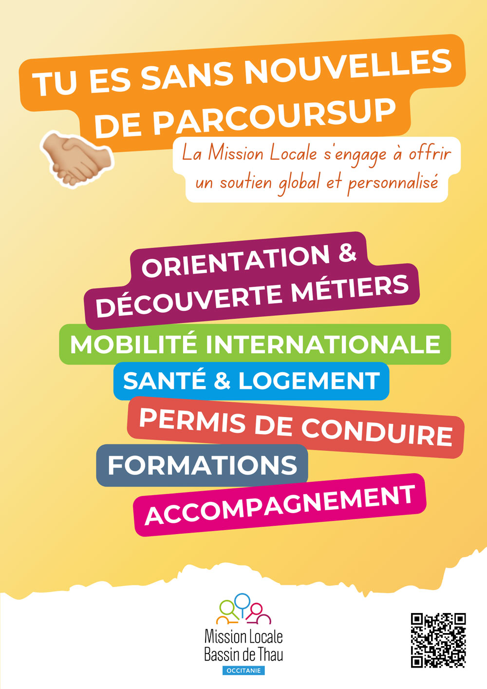 De nombreux jeunes n’ayant pas reçu de réponse positive de Parcoursup se retrouvent sans solution pour la rentrée. La Mission Locale Bassin de Thau s’engage à offrir un soutien global et personnalisé aux jeunes en situation de décrochage scolaire ou sans issue après Parcoursup. Ce soutien se concentre autour des thèmes de la découverte des métiers, l’orientation, la formation, la mobilité et la santé, dans un accompagnement individualisé.