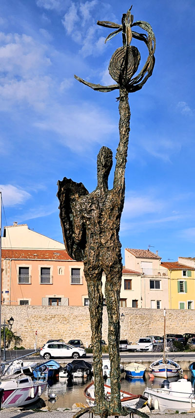 La statue d’Hernan Torres « L’homme, le soleil et le poisson » qui veille fièrement sur le port des Nacelles est devenue une œuvre indissociable du paysage mézois.
