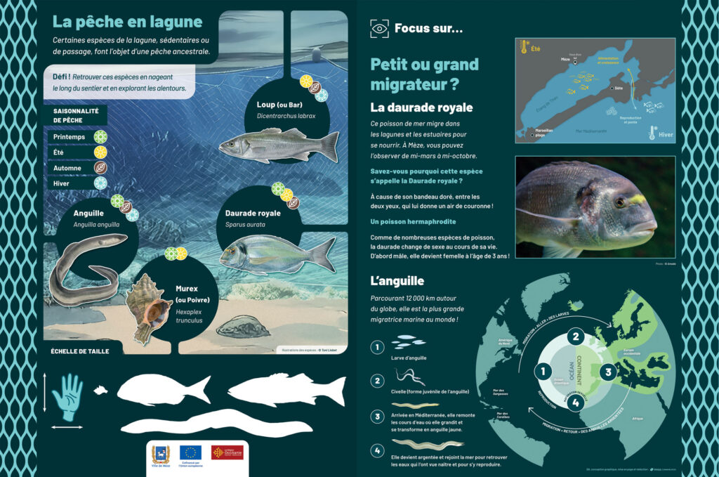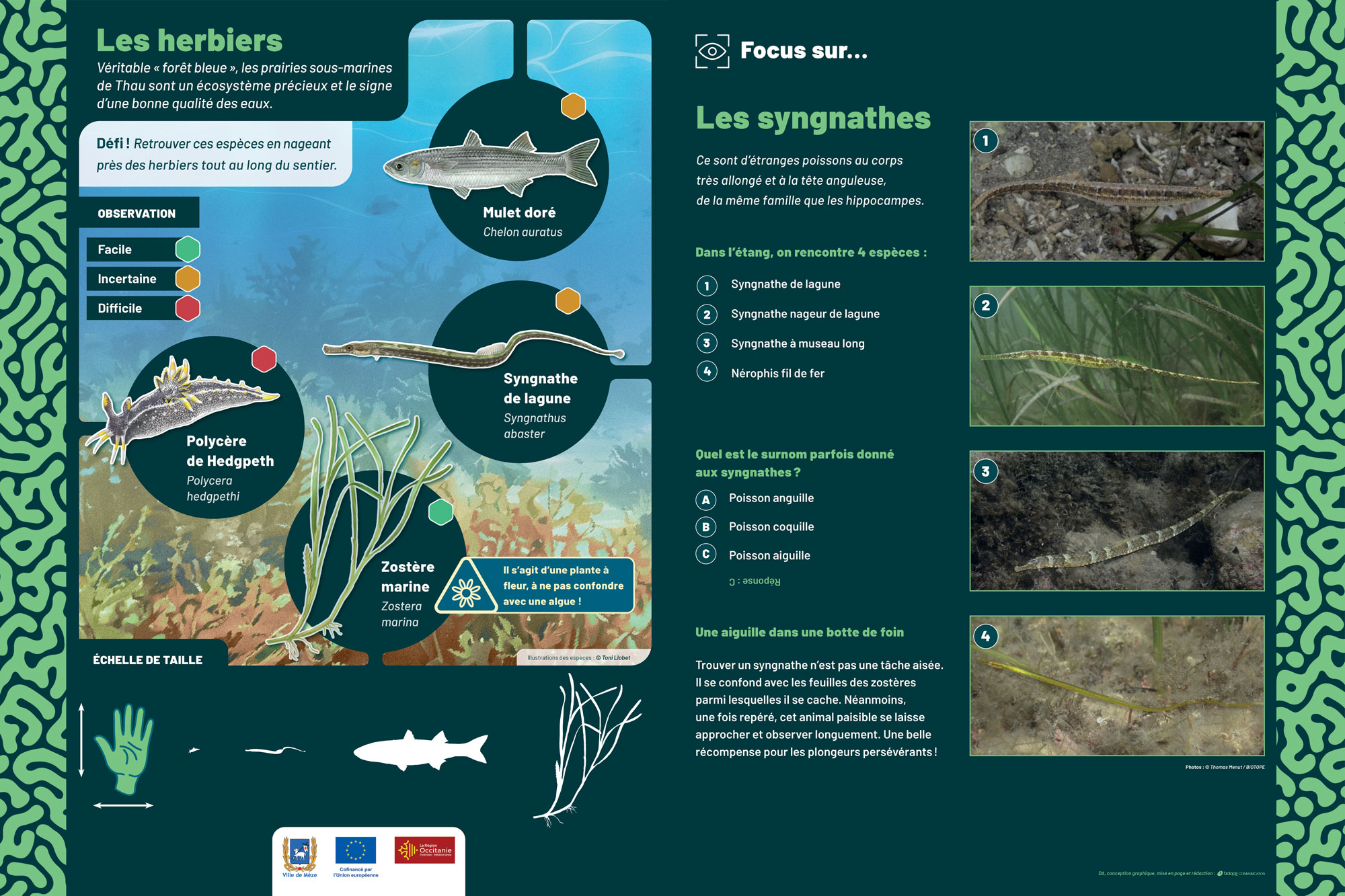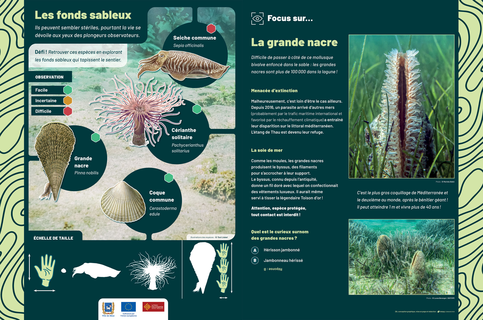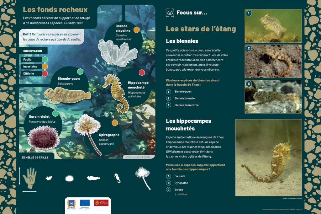 Grâce à 5 panneaux immergés, les promeneurs subaquatiques, munis de masque et tuba, peuvent découvrir l’extrême diversité de cet écosystème lagunaire : Grande Nacre, Hippocampe moucheté, Blennie, mulet…, ils seront tous là !