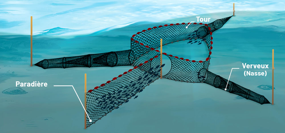 Un filet droit, la paradière, guide les poissons jusqu’au tour. Ils se retrouvent alors prisonniers d’un verveux les empêchant de faire demi-tour. Les pêcheurs utilisent également des filets maillants, des trémails, des filets encerclants, ou encore des lignes d’hameçons pour capturer les poissons.