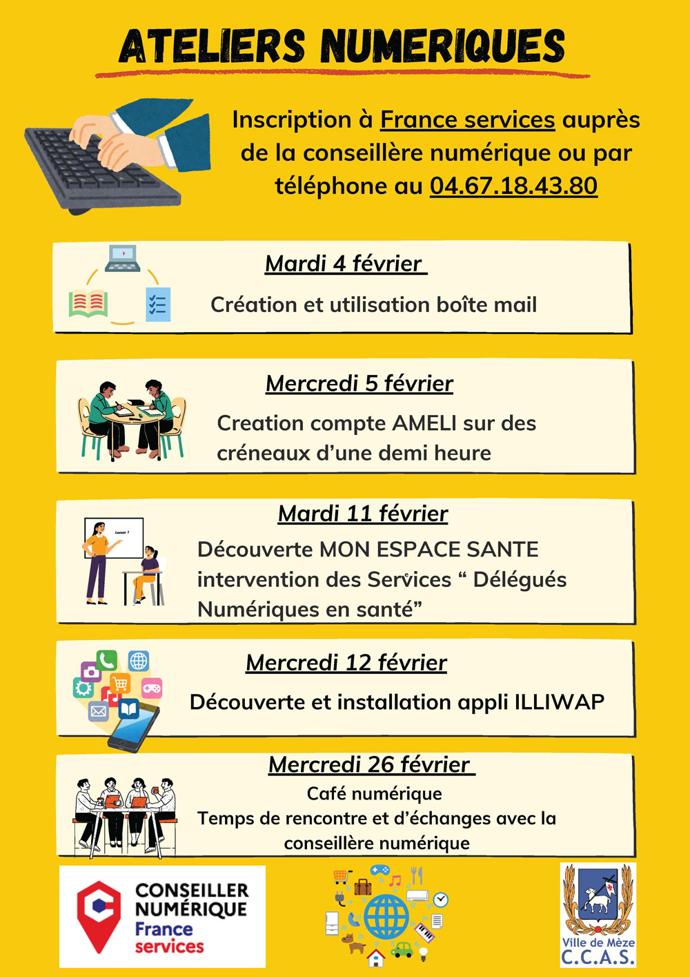 Les ateliers numériques de février 202528 janvier 2025Action sociale, Mèze actu En février, la conseillère numérique de l’antenne France Service de Mèze propose un programme d’ateliers gratuits et ouverts à tous. Article précédent L'Espangassat : programme des balades de février Article suivant La vidéo du conseil municipal du 27 janvier