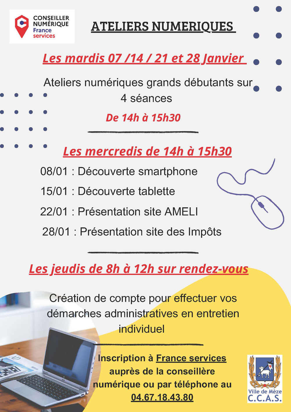 Les ateliers numériques de janvier 202517 décembre 2024Action sociale, Mèze actu En janvier, la conseillère numérique de l’antenne France Service de Mèze propose un programme d’ateliers gratuits et ouverts à tous. Article précédent Les élèves d'Hélianthe plantent les nouveaux arbres Article suivant La conchyliculture s'affiche à Mèze