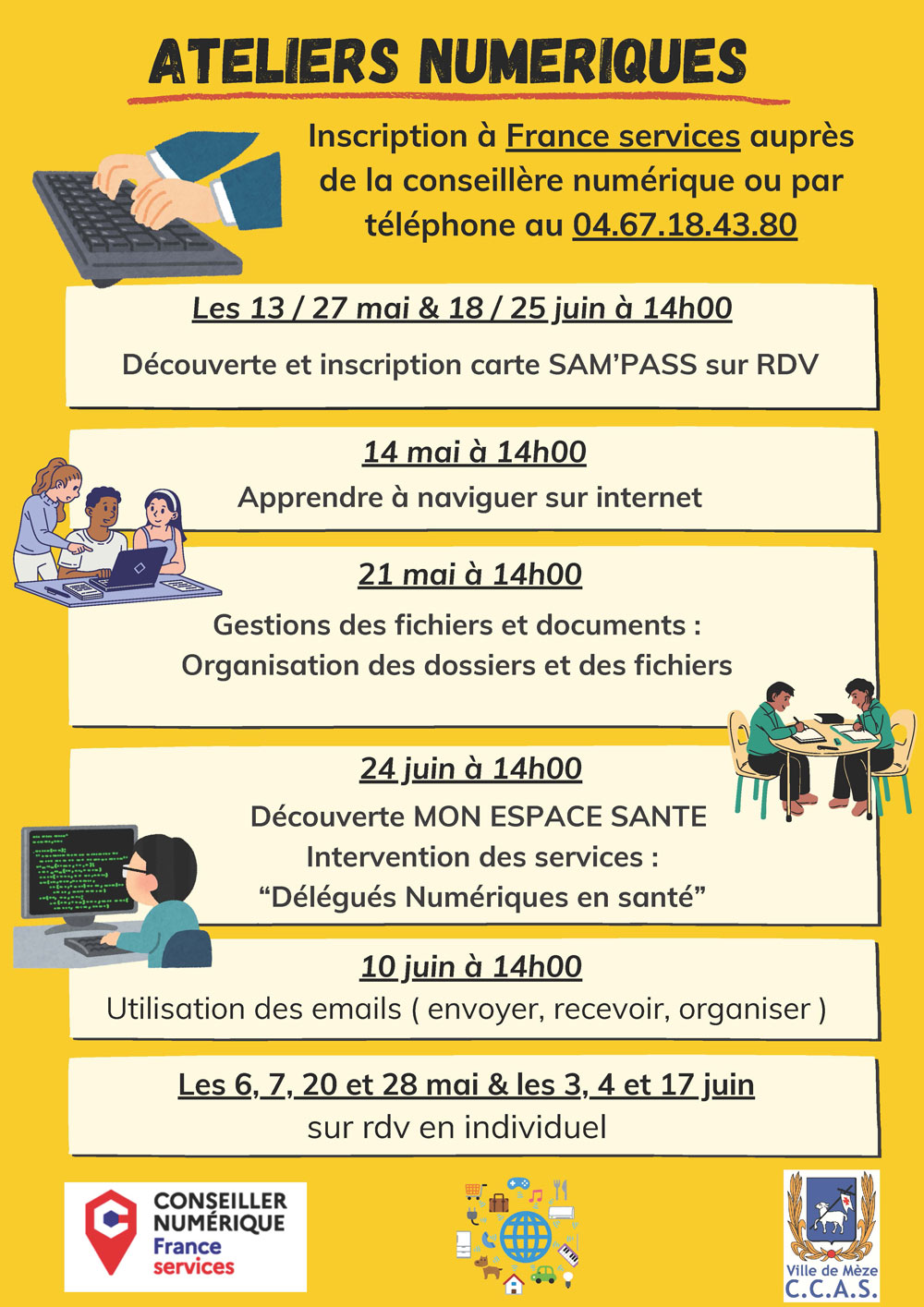 Les ateliers numériques de mai et juin 20255 mai 2025Action sociale, Mèze actu En mai et juin, la conseillère numérique de l’antenne France Service de Mèze propose un programme d’ateliers gratuits et ouverts à tous. Article précédent Poèma de Simone Azema : A Matabuòu Article suivant Les 17 et 18 mai 2025 : journée en famille et loto de l'association des Tigres de Clemenceau