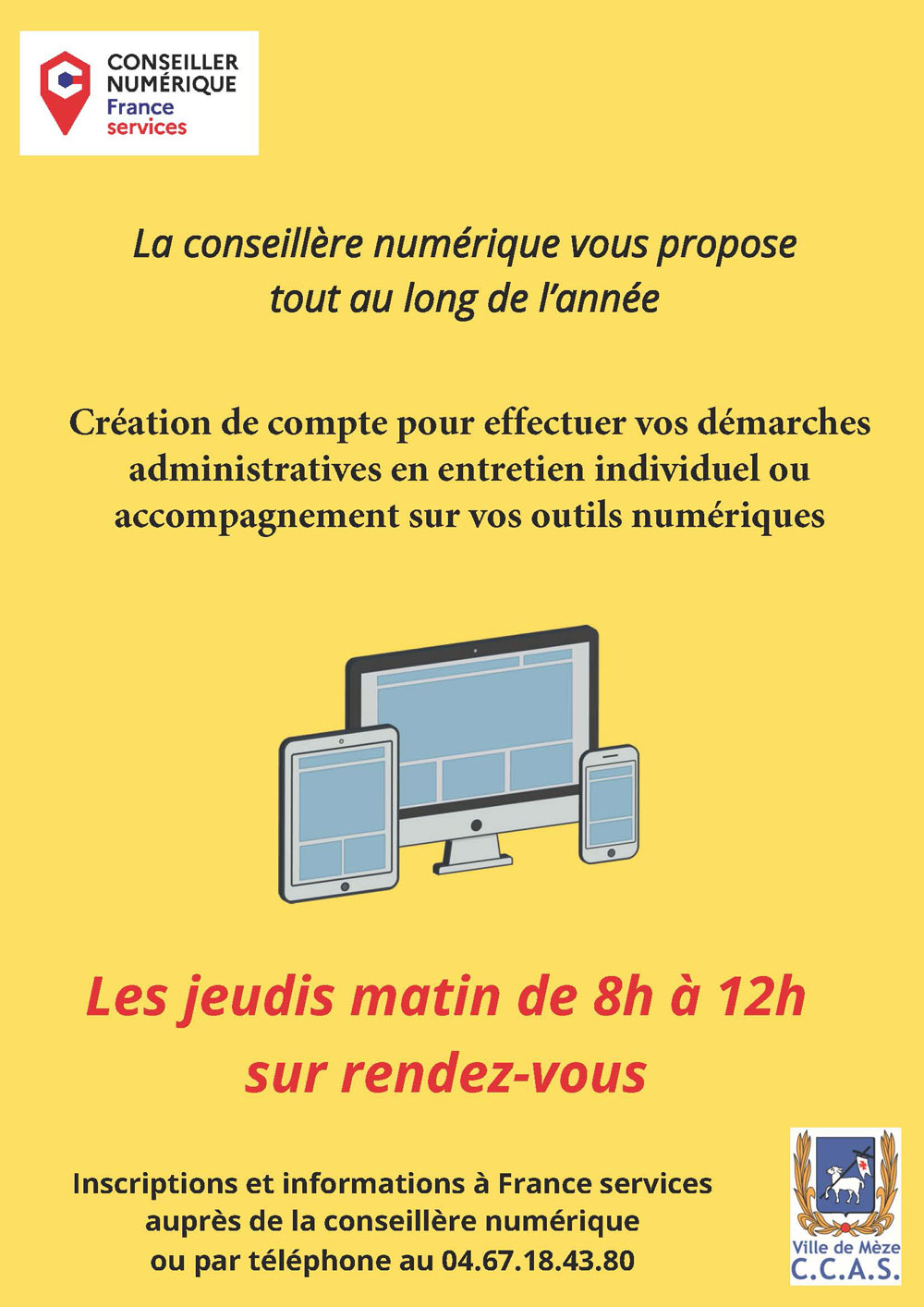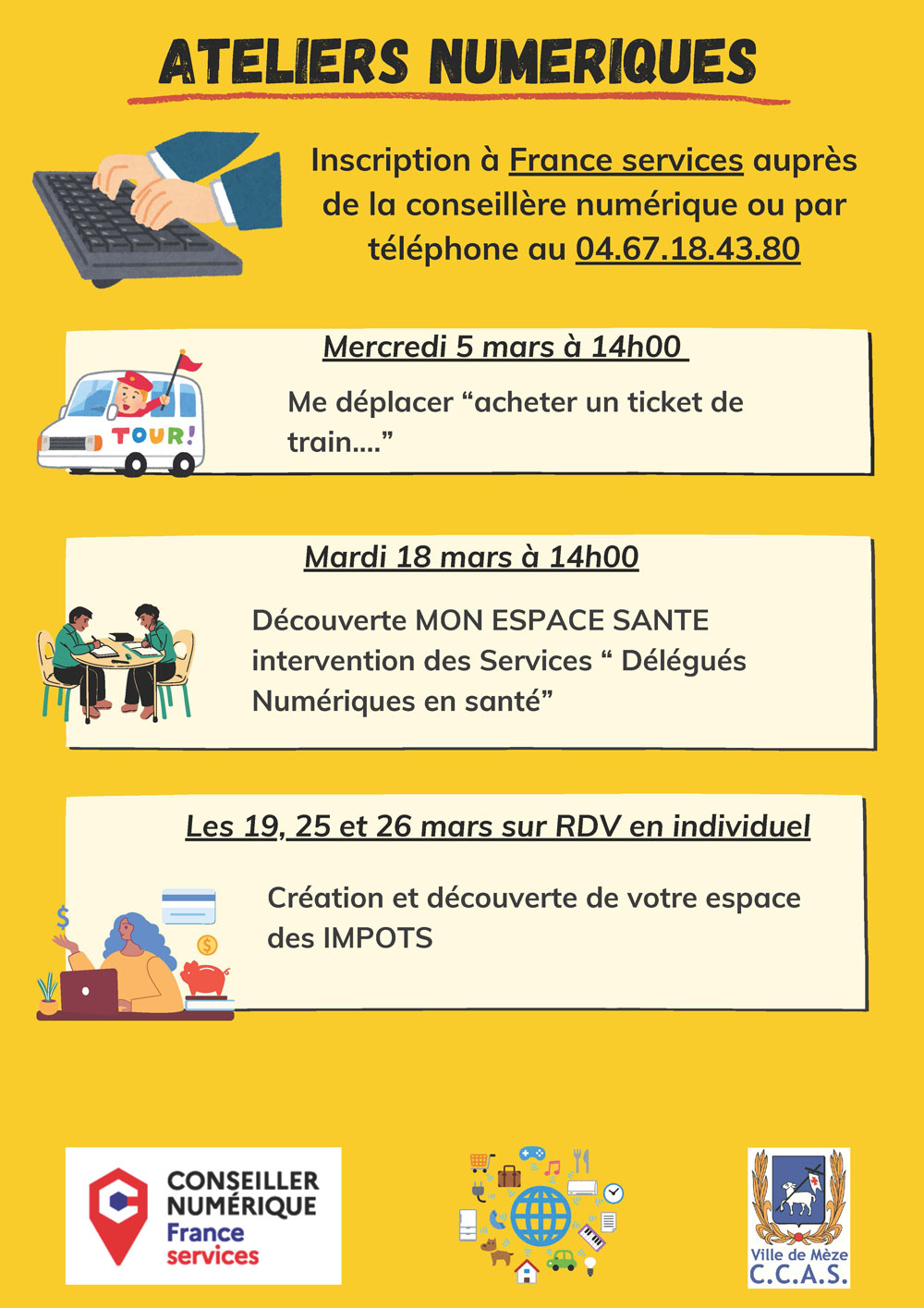 Les ateliers numériques de mars 20254 mars 2025Action sociale, Mèze actu En mars, la conseillère numérique de l’antenne France Service de Mèze propose un programme d’ateliers gratuits et ouverts à tous. Article précédent Stage de théâtre pour les 13-25 ans Article suivant Repas dansant de l'association Andalucia mézoise