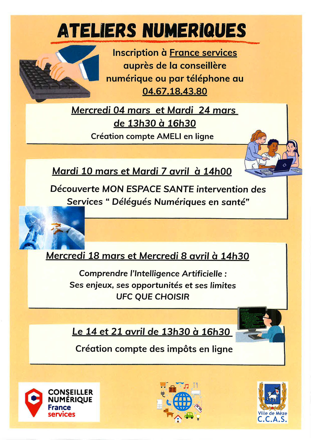 Les ateliers numériques de mars et avril 202624 février 2026Action sociale, Mèze actu En mars et avril, la conseillère numérique de l’antenne France Service de Mèze propose un programme d’ateliers gratuits et ouverts à tous. Article précédent Seul-en-scène "En modelage"