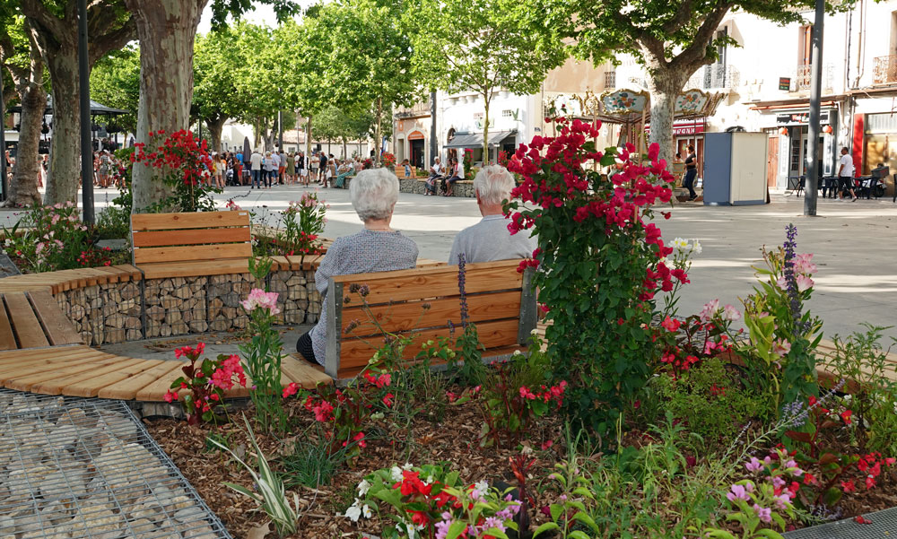 Pour rendre l’esplanade encore plus agréable, plus propice à la convivialité et à la flânerie, plus attractive pour le tourisme et le commerce, la municipalité a installé six modules de gabions. Ils servent à la fois de bancs publics et de jardinières. Ces éléments ont été entièrement conçus et réalisés par les services municipaux. Les plantes d’ornement ont été sélectionnées pour leur faible consommation en eau et sont, pour 70% d’entre-elles, vivaces et persistantes.
