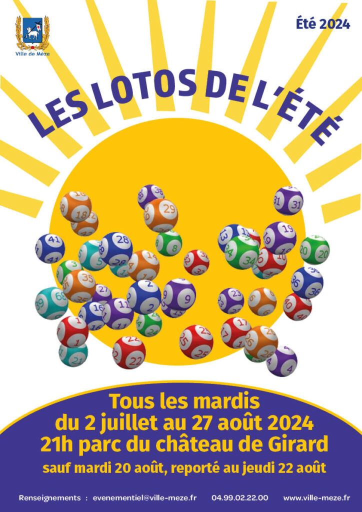 Les lotos de l’été, proposés par la Ville de Mèze, reviennent à partir du 2 juillet jusqu’au 22 août. Tous les mardis à 21h dans le parc du château de Girard (sauf mardi 20 août remplacé par le jeudi 22 août). L’occasion idéale de passer une soirée en famille ou entre amis. Les cartons seront disponibles sur place – de nombreux lots à gagner.  Suspense et bonne humeur au rendez-vous !