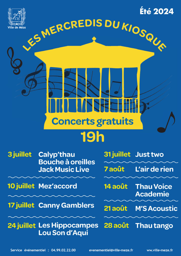 Chaque mercredi soir de l’été, dès le 3 juillet, de 19h à 21h, le kiosque ambiancera l’esplanade Yves Piétrasanta à l’occasion d’une soirée conviviale devenue incontournable. La Ville de Mèze, sous l’égide d’Eve Gimenez-Silva, adjointe à l’évènementiel, propose une scène ouverte aux artistes amateurs sur l’esplanade une fois par semaine.