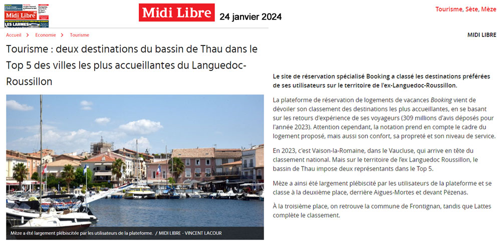 Le site de Midi Libre vient de publier un article qui montre que Mèze se classe au sommet du palmarès des destinations préférées des touristes dans le classement dévoilé par la plateforme de réservation Booking.