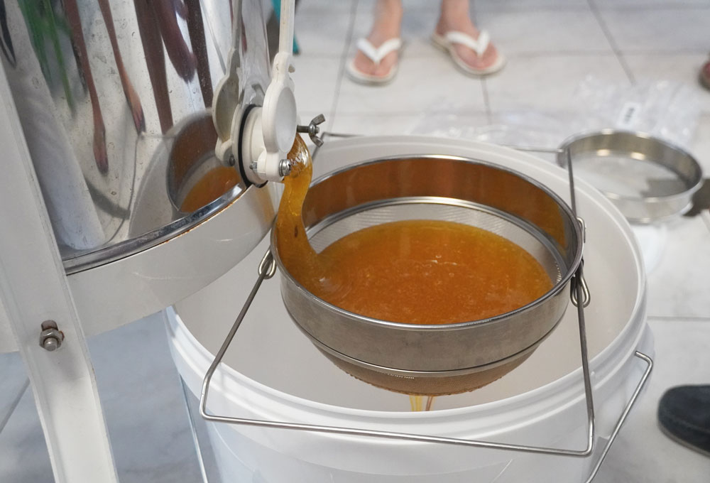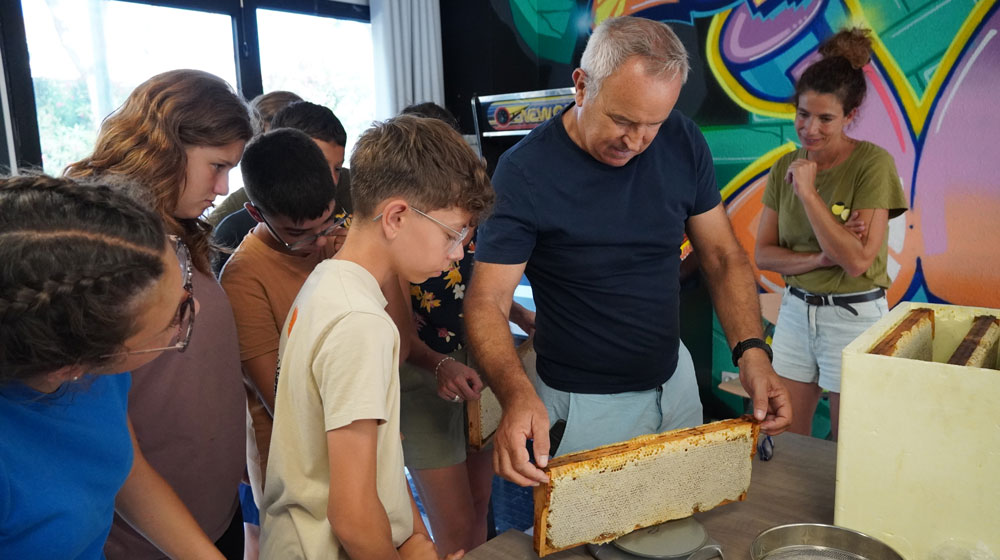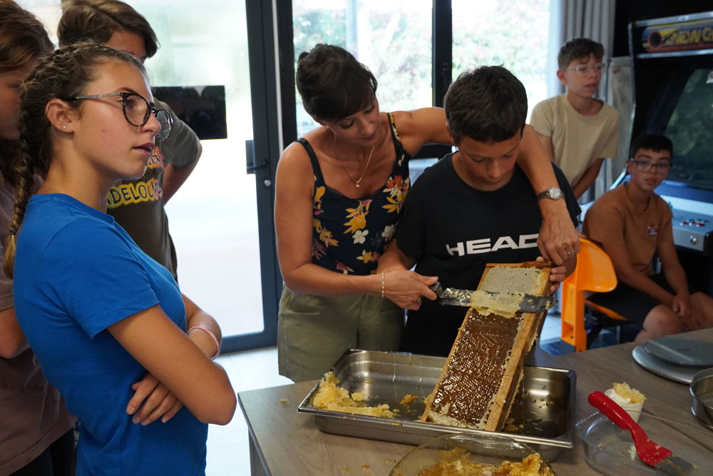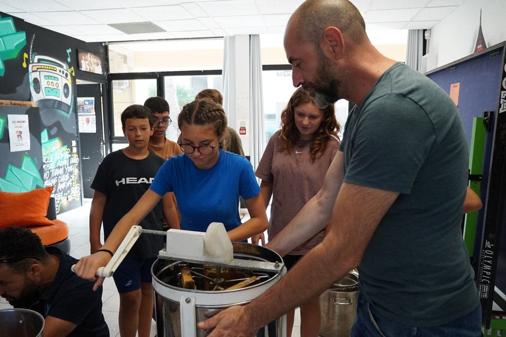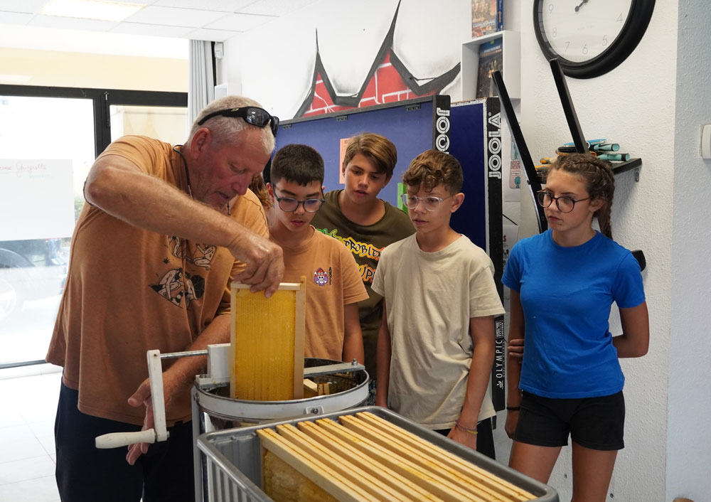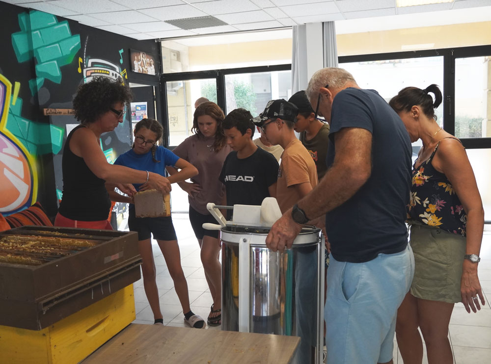 Pour la circonstance, l’espace jeunes a été transformé en véritable miellerie, mercredi 31 juillet. Apiculteur amateur, Thierry Baëza, maire de Mèze, a initié les jeunes aux diverses étapes de la récolte : désoperculation des alvéoles sur les cadres, extraction avec la centrifugeuse manuel, filtrage et conditionnement en petits pots de dégustation, étiquetage…