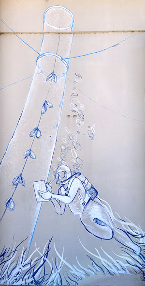 Océanorue se déploie actuellement sur plusieurs communes riveraines du bassin de Thau, avec un volet spécifiquement dédié à Mèze. Celui-ci prend la forme d’une fresque « art-science » peinte sur les façades de la Maison du Temps Libre, en lien direct avec l’écosystème de l’étang de Thau et proposant un prolongement au sentier sous-marin de la plage du Thalassa. Pensée comme une œuvre immersive, cette fresque met à l’honneur la biodiversité locale, avec un focus sur l’huître, les herbiers de zostères, la grande nacre ou encore les daurades… Elle intégrera bientôt des éléments liés à la recherche scientifique, comme les dispositifs d’observation et les outils océanographiques.