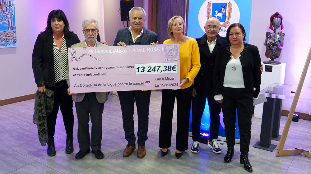 Vendredi 15 novembre, le maire de Mèze, Thierry Baëza, entouré de la conseillère municipale Patricia Leroy, et d’Annick Galibert, adjointe à l’action sociale, a remis un chèque symbolique de 13 247,38 € au professeur Dubois, Président du Comité 34 de la Ligue contre le cancer et à son secrétaire général, Richard Pagès.