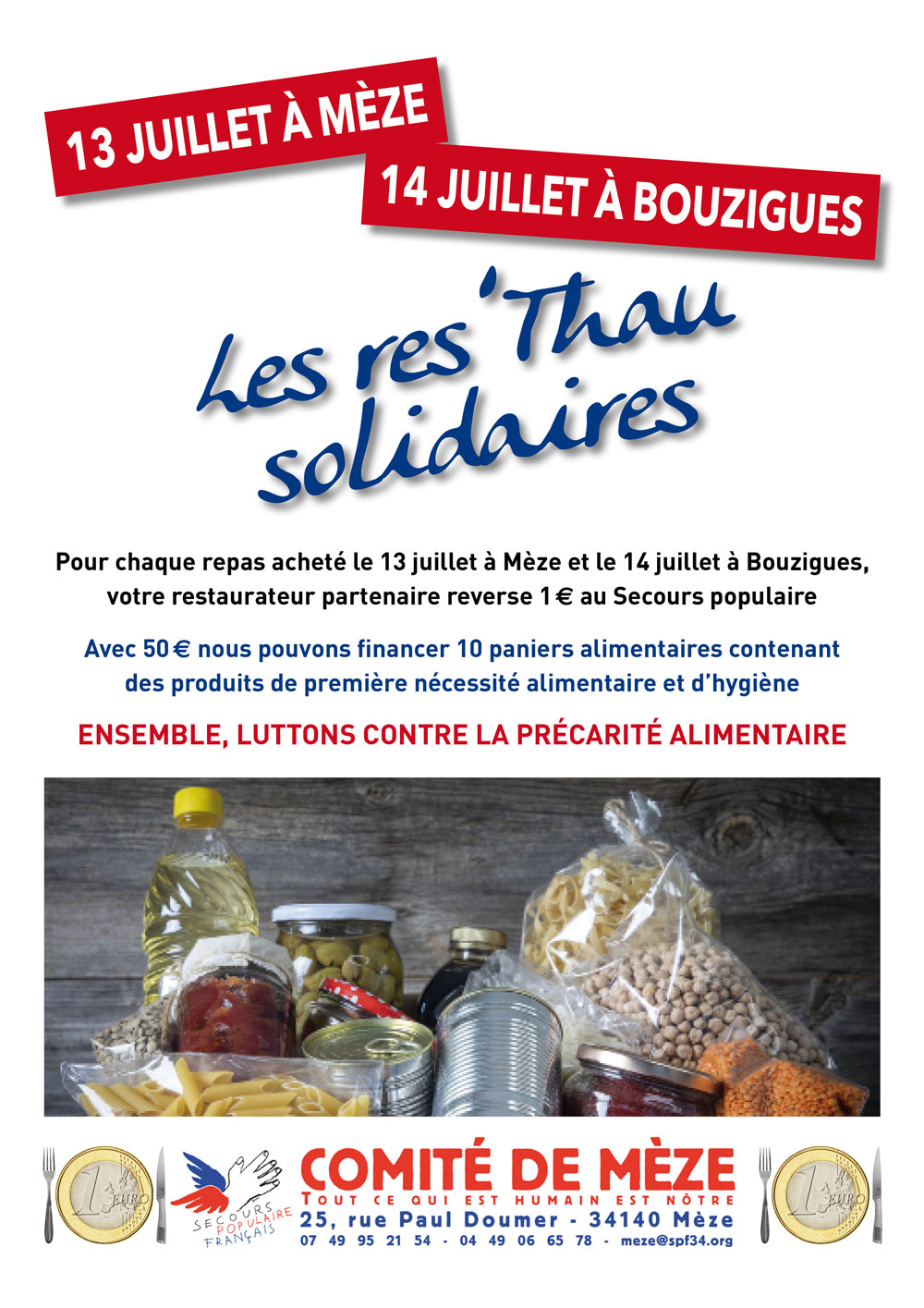 Le 13 juillet à Mèze et le 14 juillet à Bouzigues, pour le déjeuner ou le dîner, nos restaurateurs partenaires verseront au Secours populaire de Mèze un euro par repas servi (sans surcoût pour le client). Nous avons cette année étendu l’opération à de nombreux mas ostréicoles à Mèze et Bouzigues. L’argent récolté servira à financer la solidarité pour laquelle nous œuvrons tout au long de l’année.