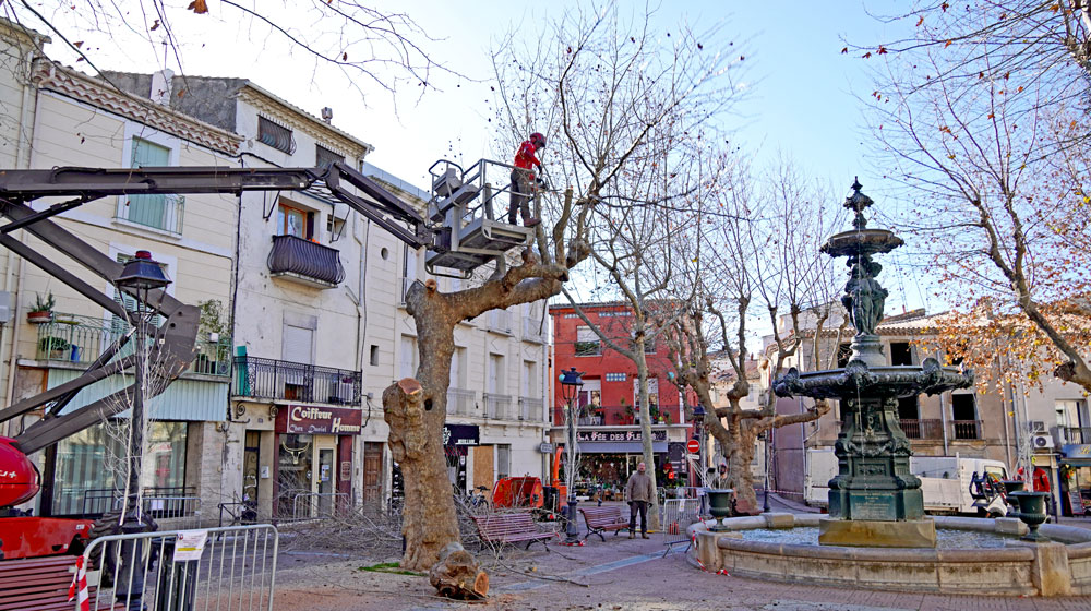 L’abattage des platanes était initialement prévu dans le cadre du chantier d’aménagement de la place. Mais, dans la soirée du 19 décembre, de fortes rafales de vent ont provoqué la chute d’une branche de plusieurs centaines de kilos, heureusement sans faire de victime. C’est la raison pour laquelle cette opération a dû être anticipée.