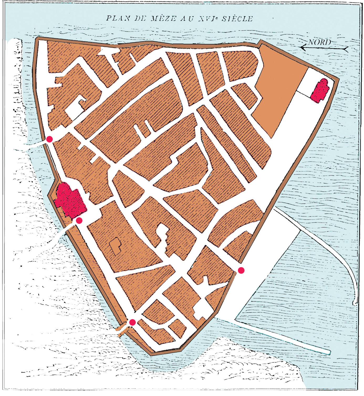 En observant le plan de Mèze au XVIe siècle, on constate que le rempart avait les pieds dans l’étang. Le port ne se composait alors que de deux digues aujourd’hui disparues.