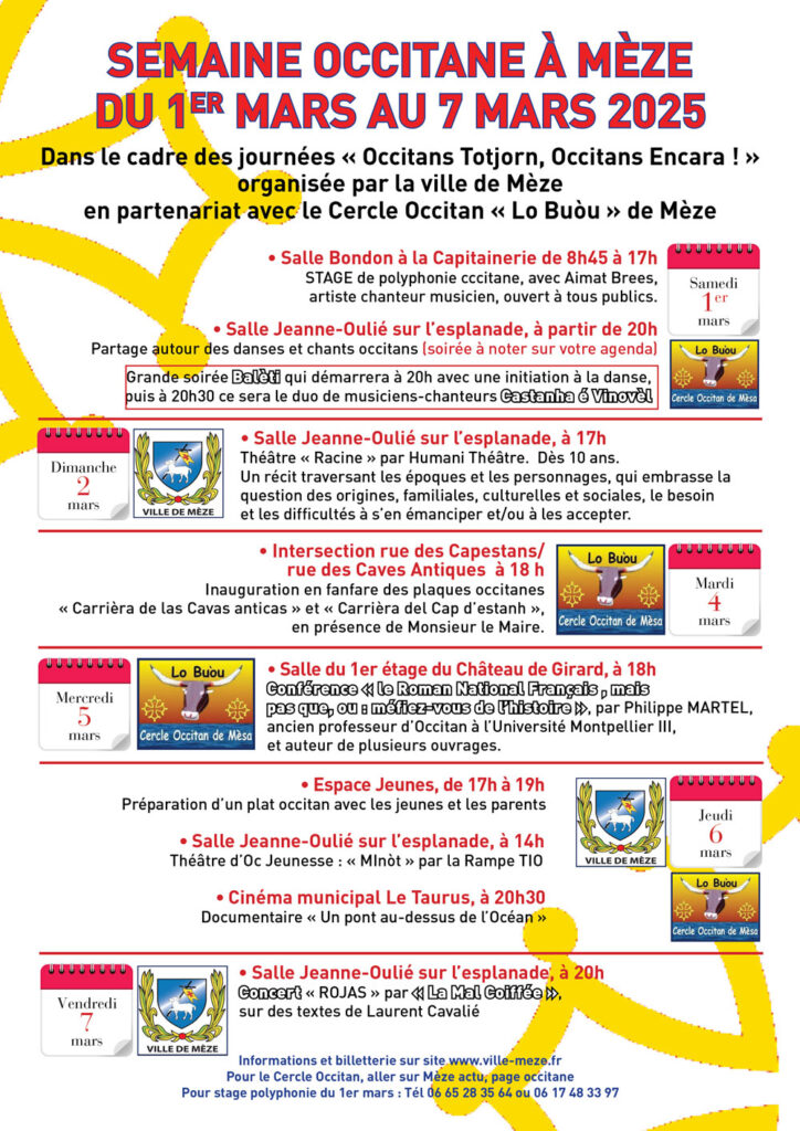Vos rendez-vous de la semaine occitane24 février 2025Page occitane Du 1er au 7 mars 2025, la Ville de Mèze et le cercle occitan Lo Buòu de Mèze proposent une série d’événements qui mettent à l’honneur la culture et la langue d’Oc : LE PROGRAMME : Article précédent Prochain conseil municipal : 3 mars 2025 Article suivant Première session plénière pour le CMJ